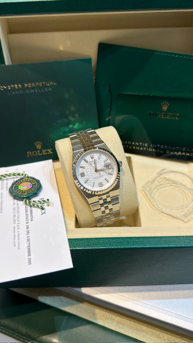 Negozio RC OROLOGI S.R.L. , situato in Via A. Poerio 22 a Mestre (Venezia), vende Rolex Land Dweller 127234. 36mm. Ghiera zigrinata oro bianco. Nuovo mai indossato Dicembre 2025. Garanzia 5 anni. Completo full set. Pronta consegna. Spettacolare. Valuto permute con controllo in negozio, principalmente con Rolex recenti, nuovi o revisionati negli ultimi 24 mesi con documento, completi full set, solo in eccellenti condizioni. Contatto diretto Whatsapp 3314187649. Pagamento solo bonifico bancario, bancomat, carta di credito o contanti nei limiti di legge ( NO “tutto contanti”, no rate, no finanziamenti, no dilazioni, NO TAX FREE ).