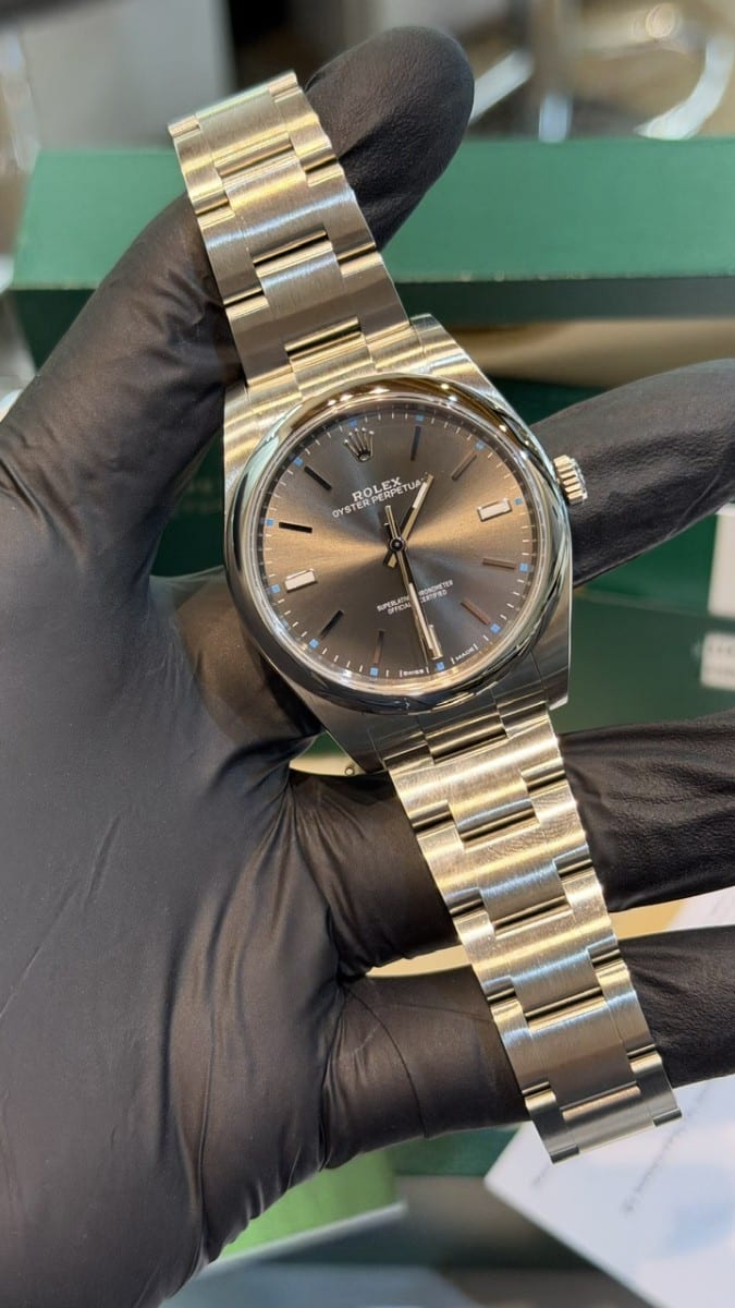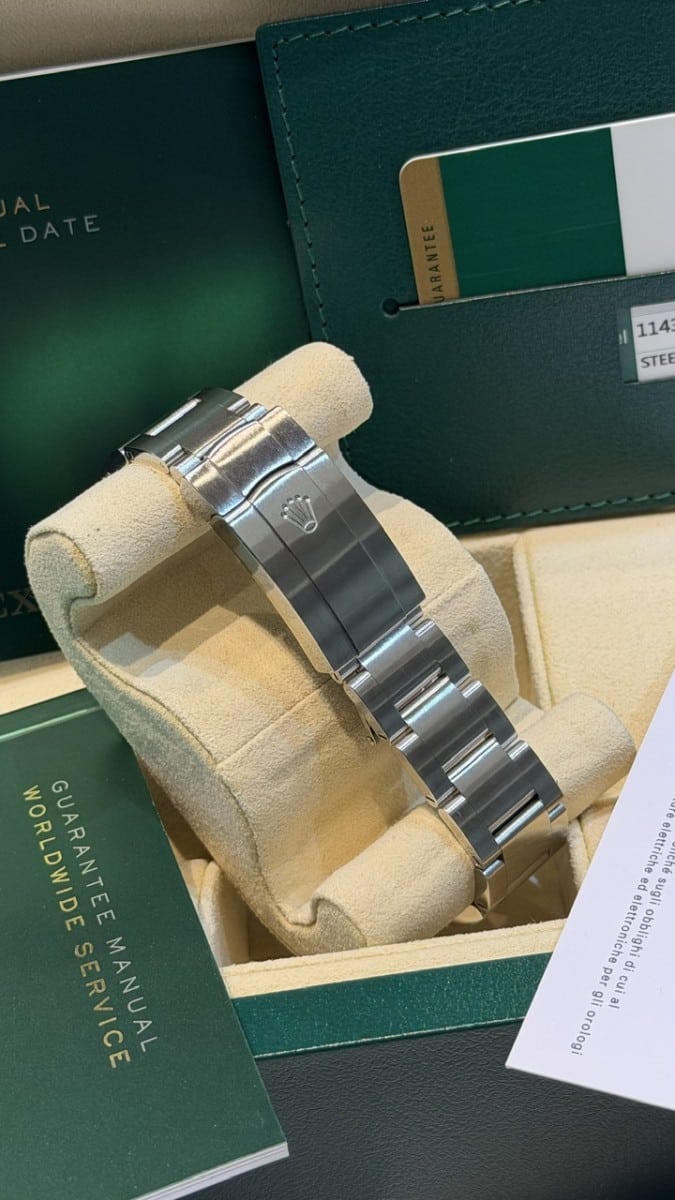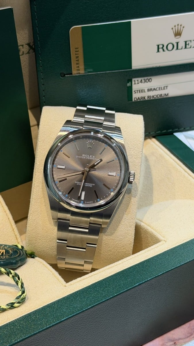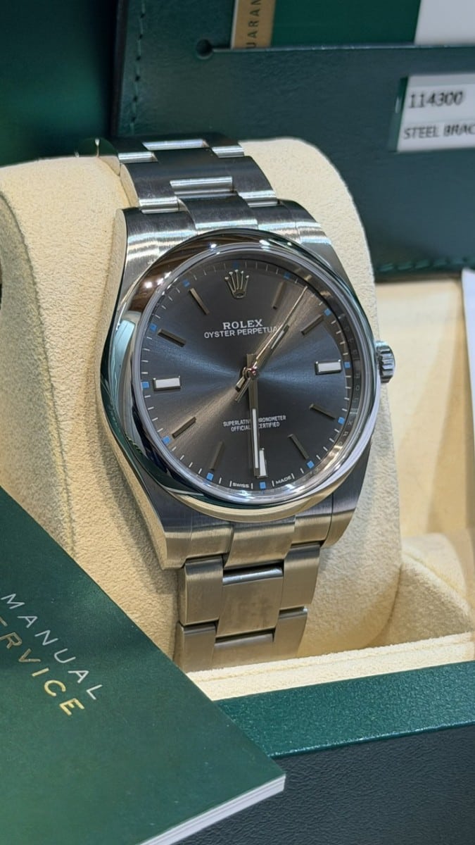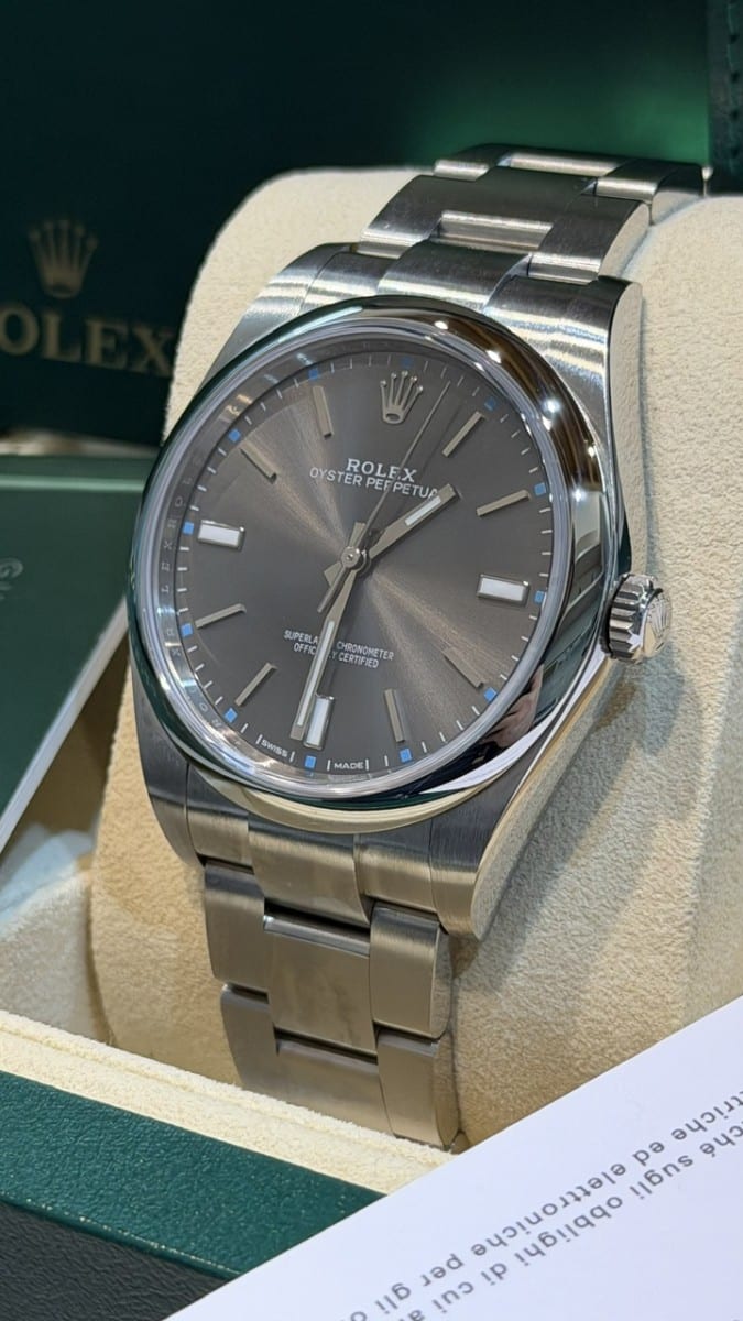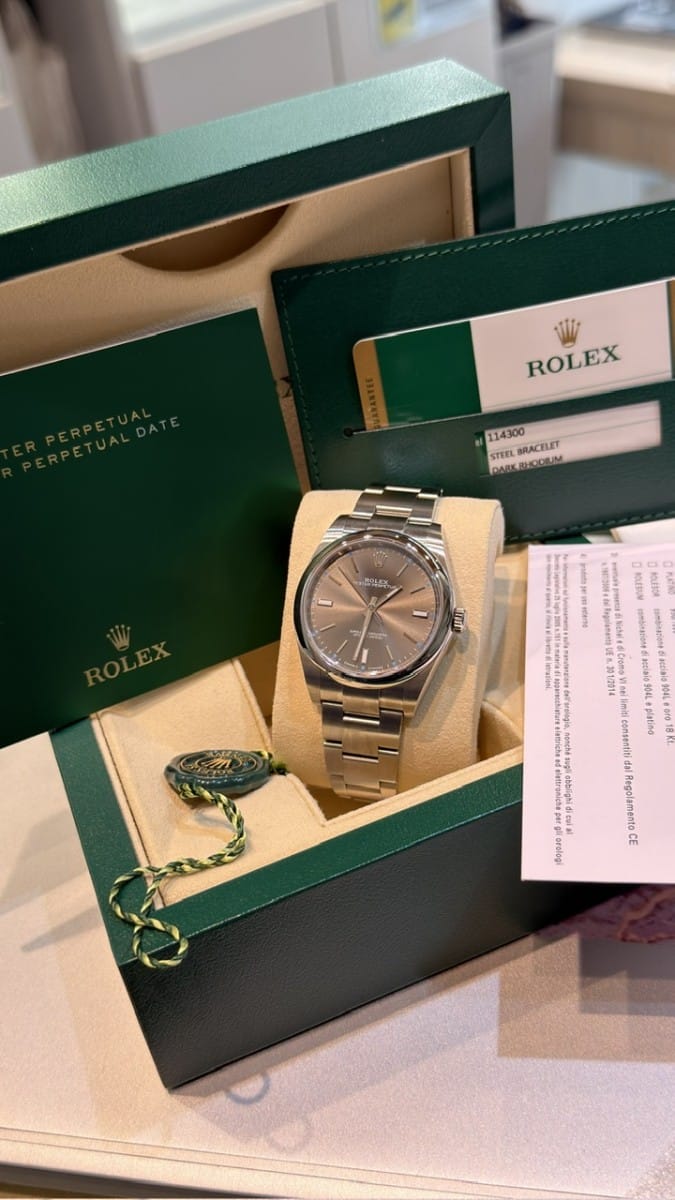 Negozio Rc Orologi S.R.L. , situato in Via A. Poerio 22 a Mestre (Venezia), vende Rolex Oyster Perpetual 114300. 39mm acciaio. Fuori produzione. Quadrante Rhodium. Come nuovo anno 2016. Full set. Unico proprietario. Revisione Aprile 2026 documentata. Bellissimo. Valuto permute con controllo in negozio, principalmente con Rolex recenti, nuovi o revisionati negli ultimi 24 mesi con documentazione scritta, completi full set, solo in eccellenti condizioni. Contatto diretto Whatsapp 3314187649. Pagamento solo bonifico bancario, bancomat, carta di credito, American Express ( anche a distanza tramite apposito link “ pay by link” ) o contanti nei limiti di legge ( NO “tutto contanti”, NO rate, NO finanziamenti, NO dilazioni, NO Tax Free ).